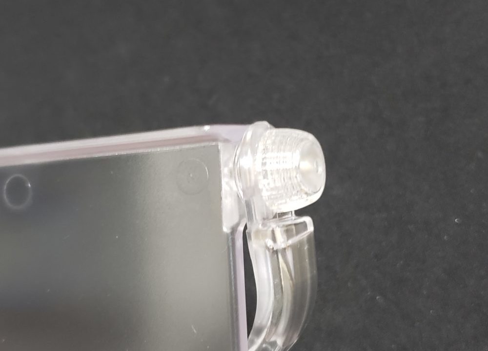 取り付けイメージ図写真のようにツメをモニター上部端に引っ掛けます。今回取り付けるモニターはベゼルレスという外枠の幅があまりないタイプですが、わずかながらツメが画面内に入り込みましたが、ツメも短く、色も透明なので画面が見にくくなるということもなく、全く問題ありませんでした。